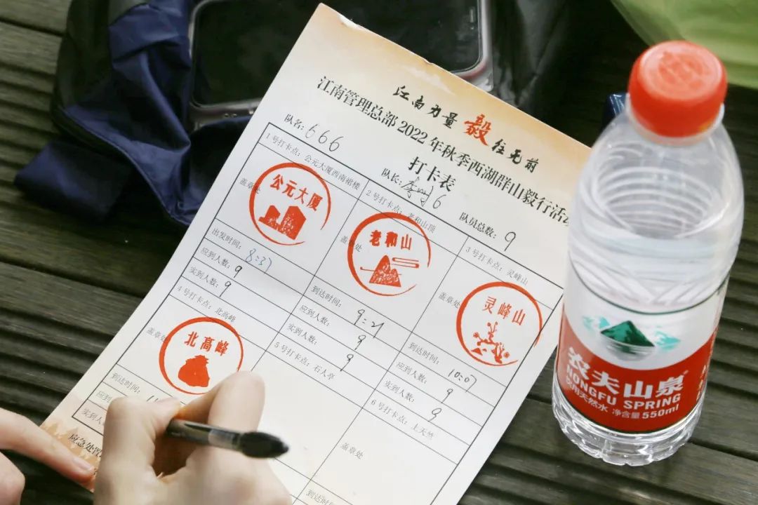 從老和山,到靈峰山,再到北高峰……大家一路前行,依次在沿途各個打卡點完成集結打卡,并合影留念。